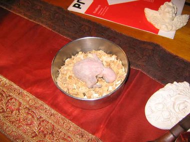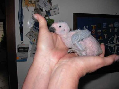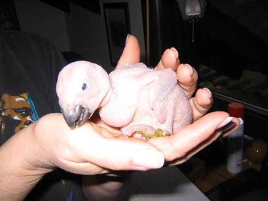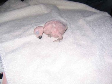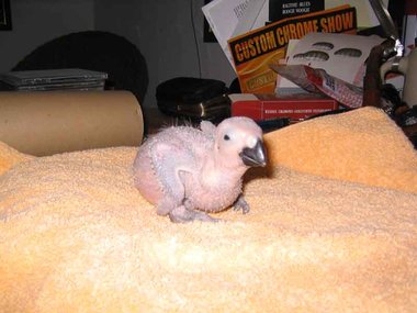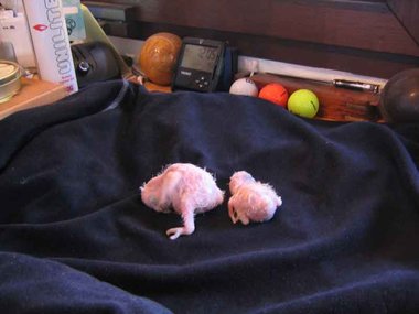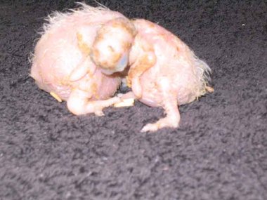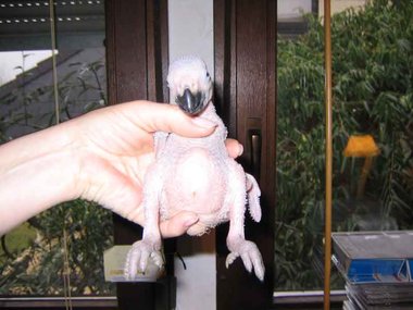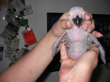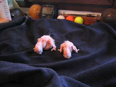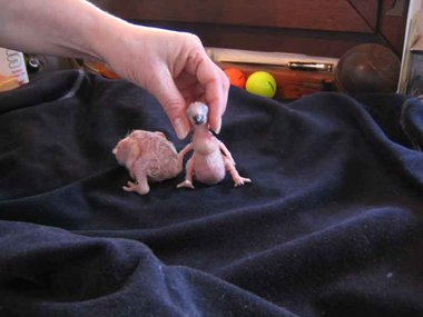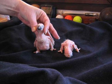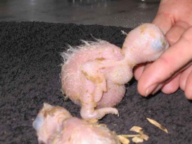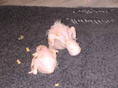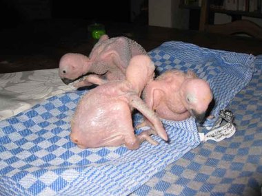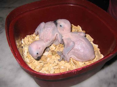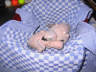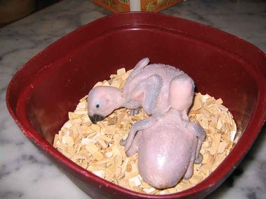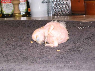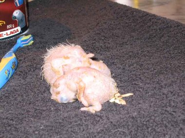 Da zwar die Henne das Nest zum Koten kurz verlässt, nicht jedoch die Brut, verschmutzt das Nest sehr schnell - Grund für die Entwicklung von Krankheitserregern und die Steigerung der Mortalitätsrate im Nest. Deshalb ist bei mir zunächst einmal wöchentlich, später alle drei Tage eine Reinigung des Nestes angesagt. Ich nutze diese Gelegenheit, um die Kücken zu entnehmen, ihr Gewicht zu kontrollieren und - soweit erforderlich - vorsichtig zu reinigen. Das Nest wird mit einer Grundlage aus Buchengranulat ausgestattet. Das saugt den Kot der Kleinen bis zur nächsten Reinigung auf. Langsam beginnt der erste Flaum, die Jungtiere wechseln ihre rosa Farbe in ein dunkler werdendes Grau. Mit der dritten Woche sind die ersten Federkiele an den Flügeln zu erkennen.